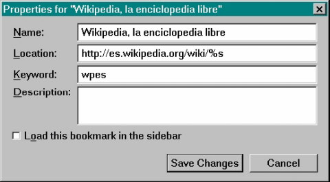 Entonces, si en las propiedades del Favorito ponemos en «Localización» el valor http://es.wikipedia.org/wiki/%s (es decir, la parte común más %s al final), en «Palabra clave» ponemos wpes y grabamos los cambios, ya tenemos lo que buscábamos.